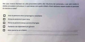 La posizione della Cgil – Non è rimasta in silenzio la Fiom Cgil di Treviso. «Questa pratica che trasforma un momento di crisi e già drammatico in un gioco crudele è un attacco alla dignità dei lavoratori e una manipolazione inaccettabile della solidarietà che dovrebbe regnare tra colleghi», ha tuonato il sindacato in una nota. Il segretario generale della categoria, Manuel Moretto, ha denunciato l’accaduto come «una mancanza di rispetto nei confronti dei lavoratori e delle lavoratrici e anche un tentativo di disgregare il tessuto sociale di un’azienda». E ha aggiunto: «La risposta alle difficoltà dovrebbe essere l’unità, non la divisione. Questi metodi non rappresentano neanche una consultazione democratica. Non permetteremo che i lavoratori siano costretti a giocare a questa partita umiliante». Intanto, dalla segreteria provinciale hanno indetto una mobilitazione per la giornata del 21 gennaio, con le richieste di ritiro immediato di ogni procedura legata al sondaggio e garanzie per l’occupazione. Se la situazione non dovesse sbloccarsi, i sindacati, fa sapere il Quotidiano Nazionale, sono pronti a un’agitazione duratura.
