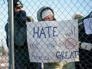 Manifestanti a Minneapolis il giorno dopo l’uccisione di Pretti. Il cartello recita: “L’odio non renderà grande l’America”